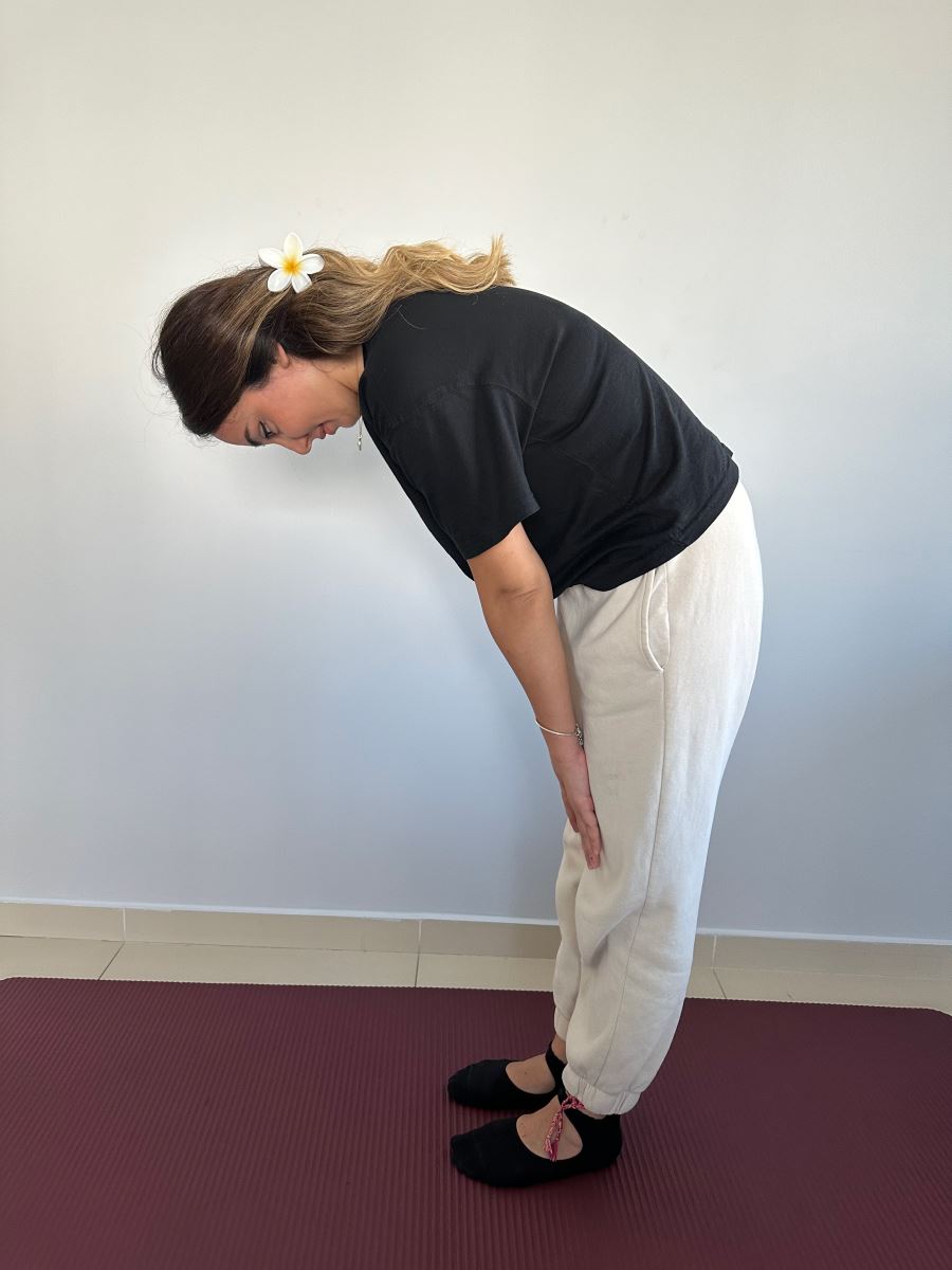 Ayakta dururken ellerinizi uyluk bölgesine koyun, vücudunuzu öne doğru eğerek 5’e kadar sayın.