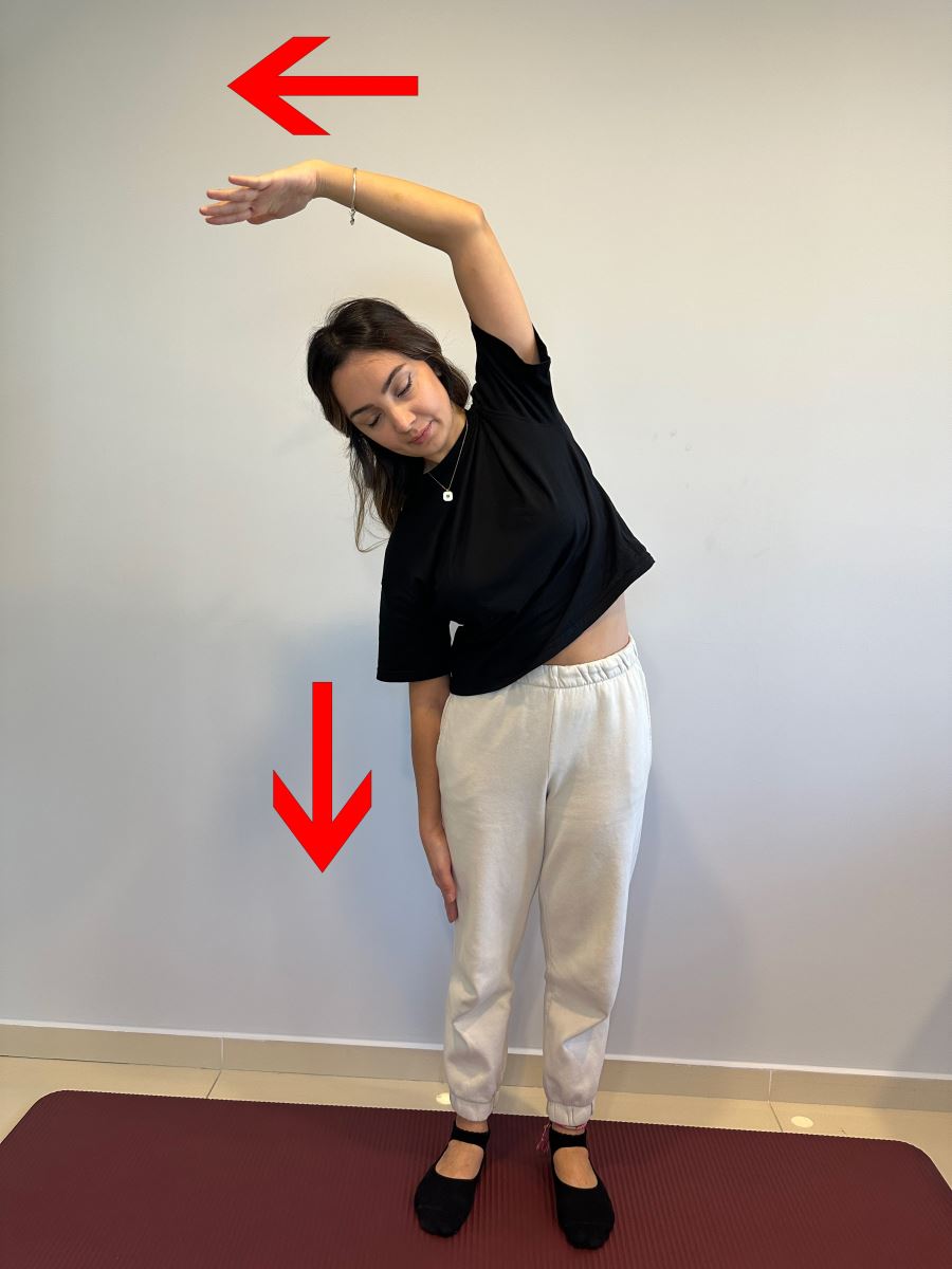 Ayakta dururken sol elinizi baş üstüne doğru kaldırın. Sağ elinizi uyluk bölgesine