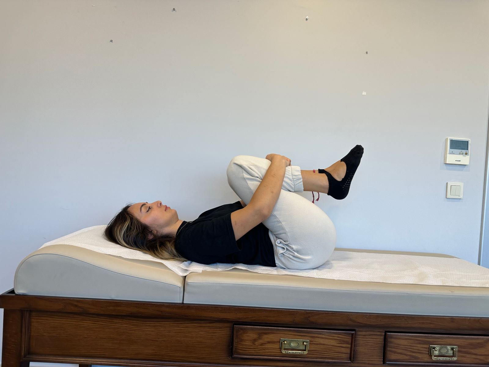 Sırtüstü pozisyonda yatın. Bir bacağınız düz pozisyondayken diğerini her iki elinizle kendinize