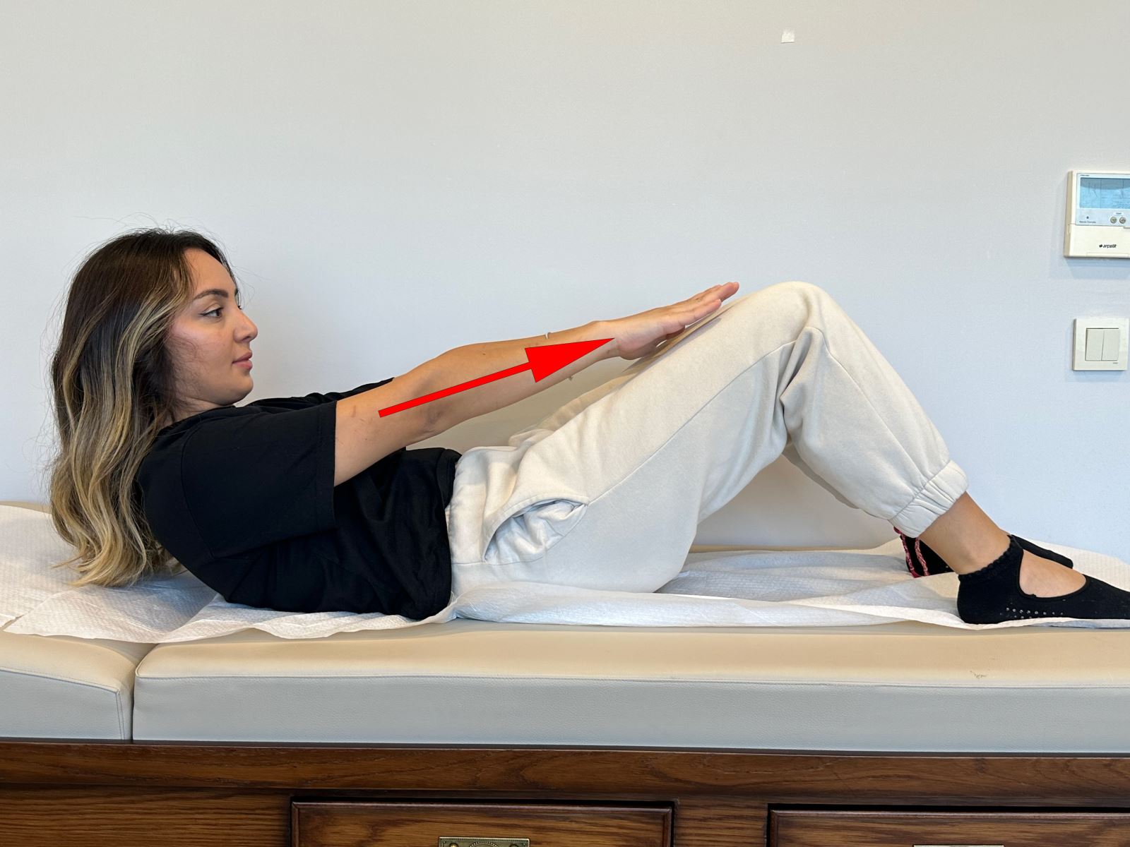 Dizleriniz bükülü yatakta sırtüstü yatarken elinizi bel çukurunuza yerleştirin.