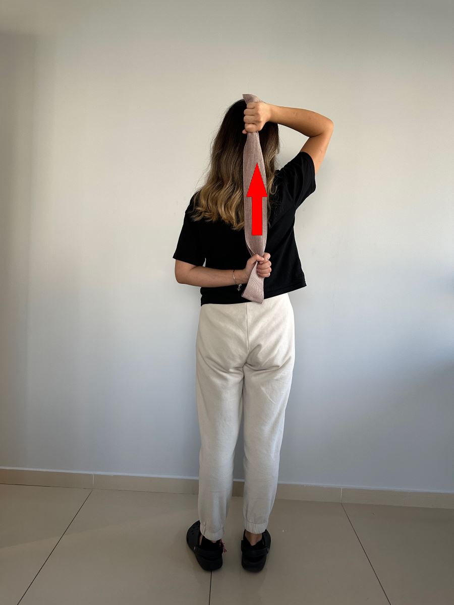 Dirseğinizi bükerek elinizi baş arkasına götürün. Daha sonra elinizi yukarı kaldırarak