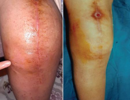 Diz protezi ameliyatı yapılmış hastanın enfekte olmuş dizi. Dizde şişlik ve akıntı mevcut.
