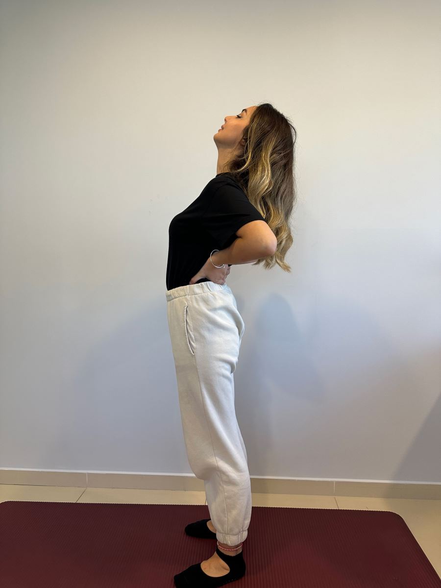 Ayakta dururken eller belde sırtınızda gerginlik hissedene kadar belinizi arkaya doğru bükün.