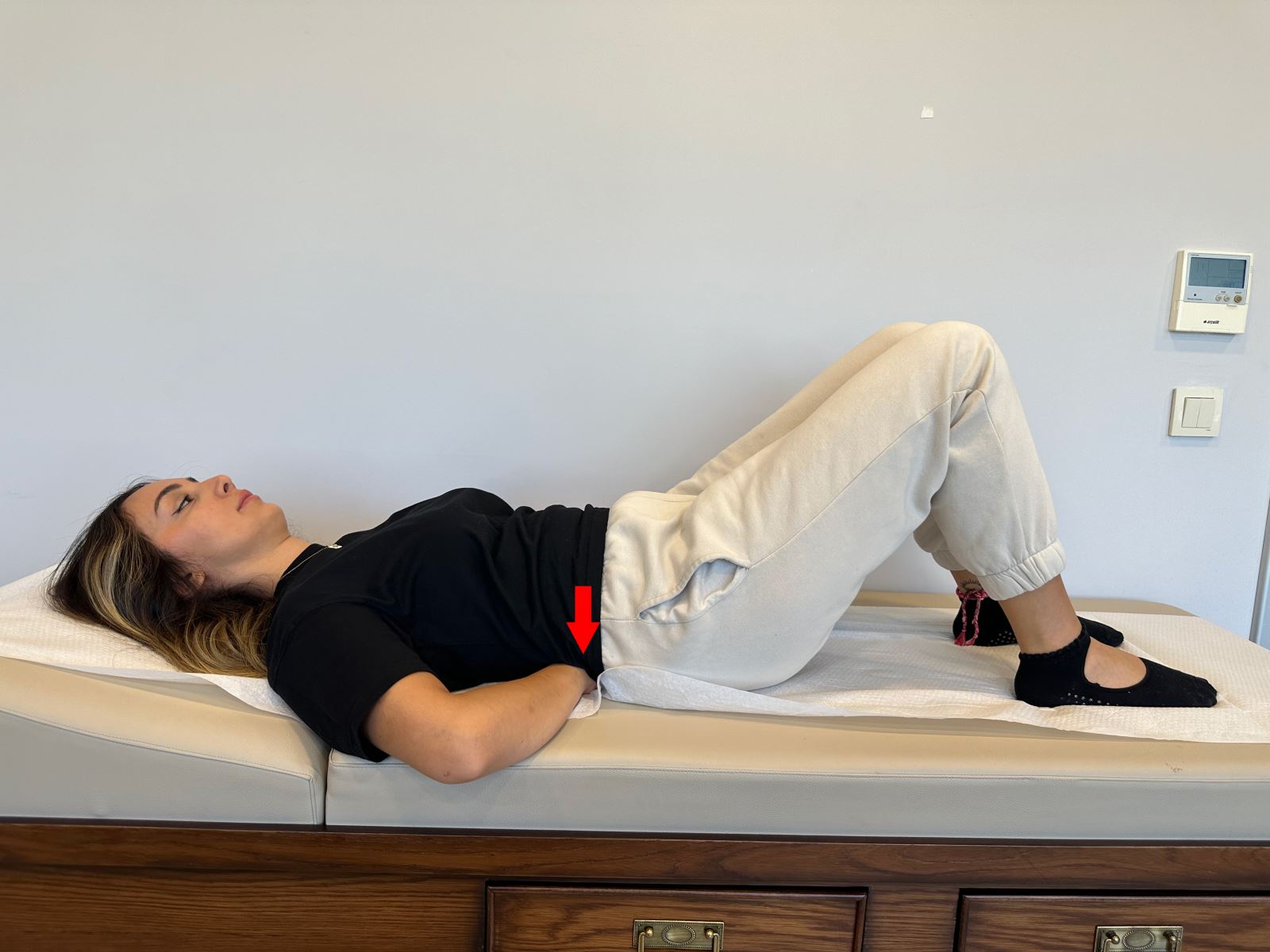 Dizleriniz bükülü yatakta sırtüstü yatarken elinizi bel çukurunuza yerleştirin.
