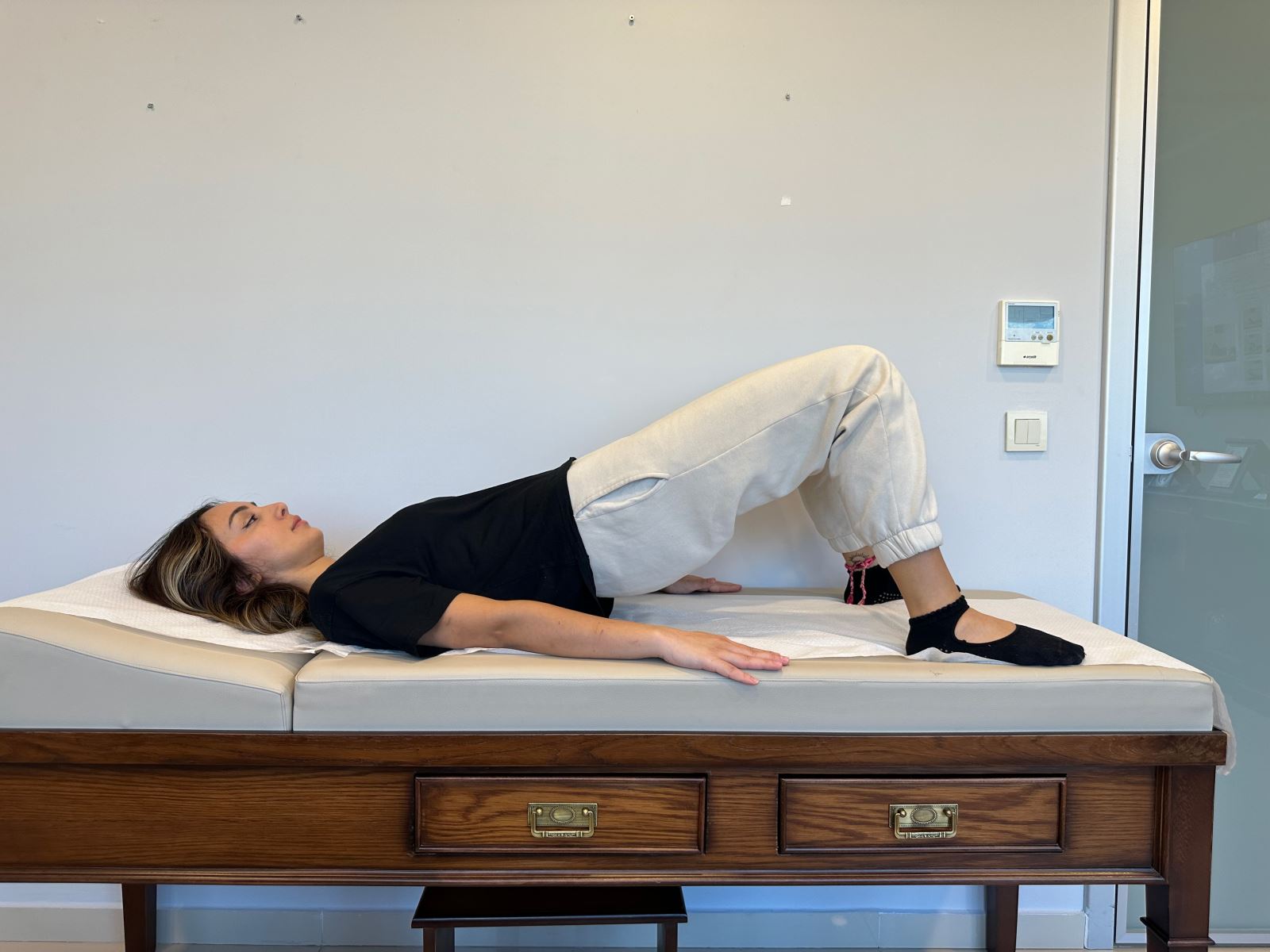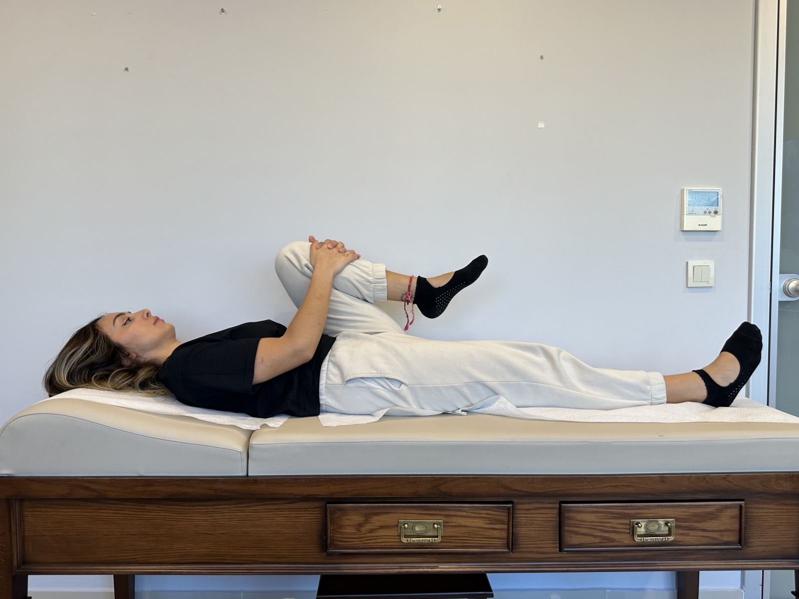 Sırtüstü pozisyonda yatın. Bir bacağınız düz pozisyondayken diğerini her iki elinizle kendinize