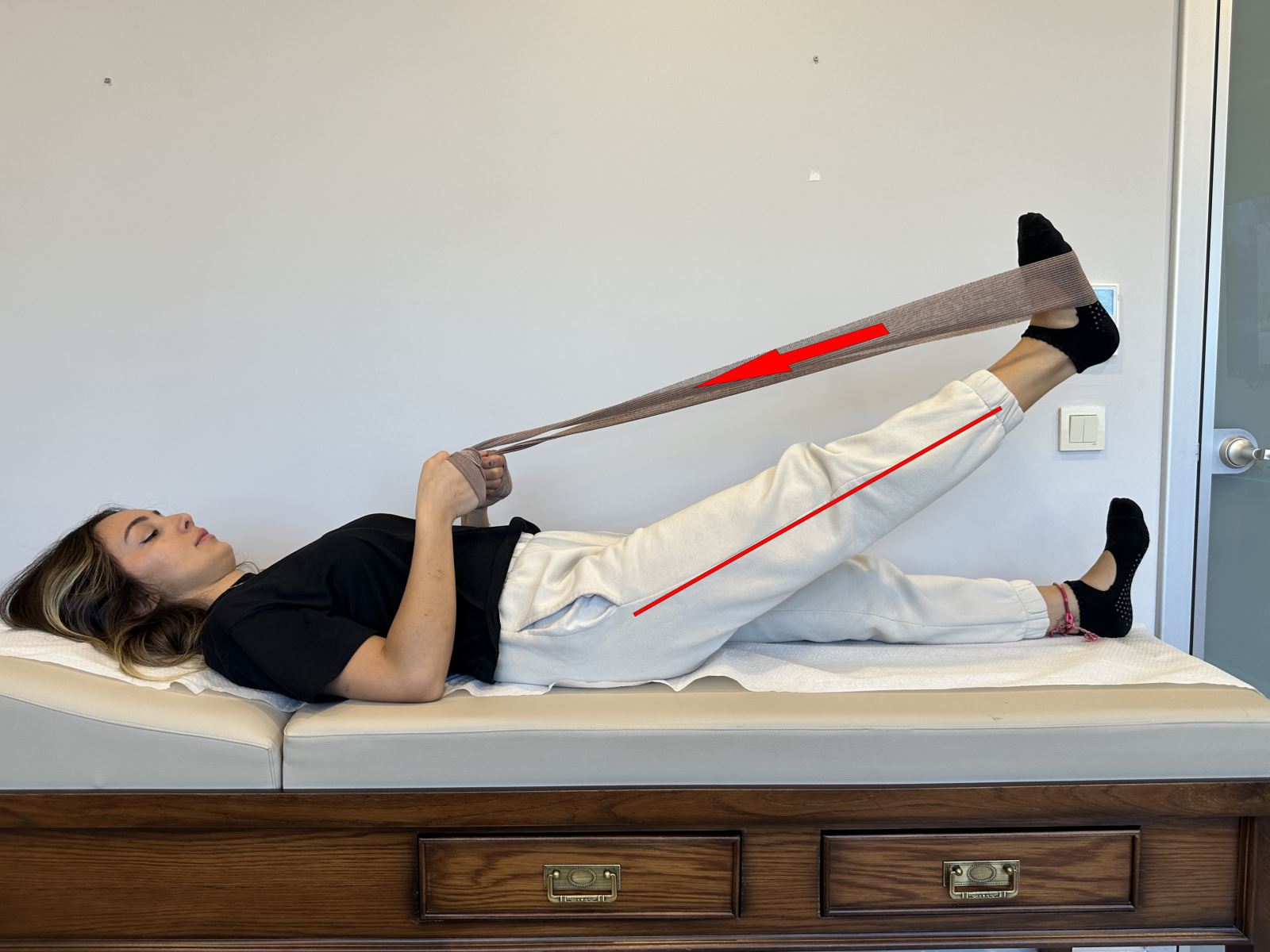 Ellerinizle bandajı çekerek bacağınızı yerden havaya kaldırın. Bu sırada diz bükülmemeli ve