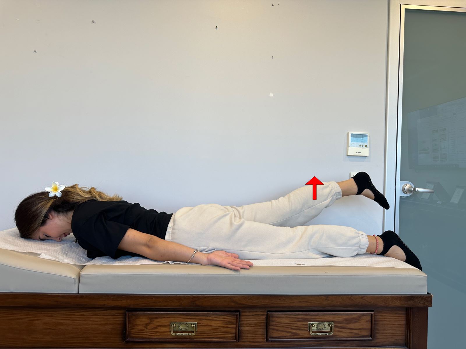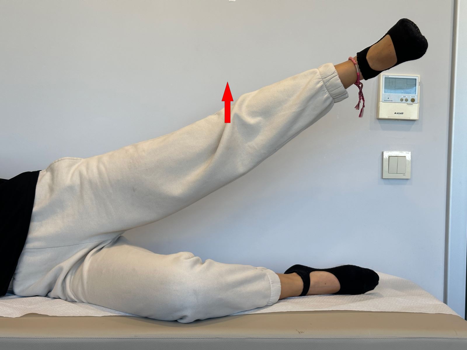 Yüzüstü pozisyonda yatarken dizinizi bükmeden sağ bacağınızı yataktan 20 cm havaya kaldırın.