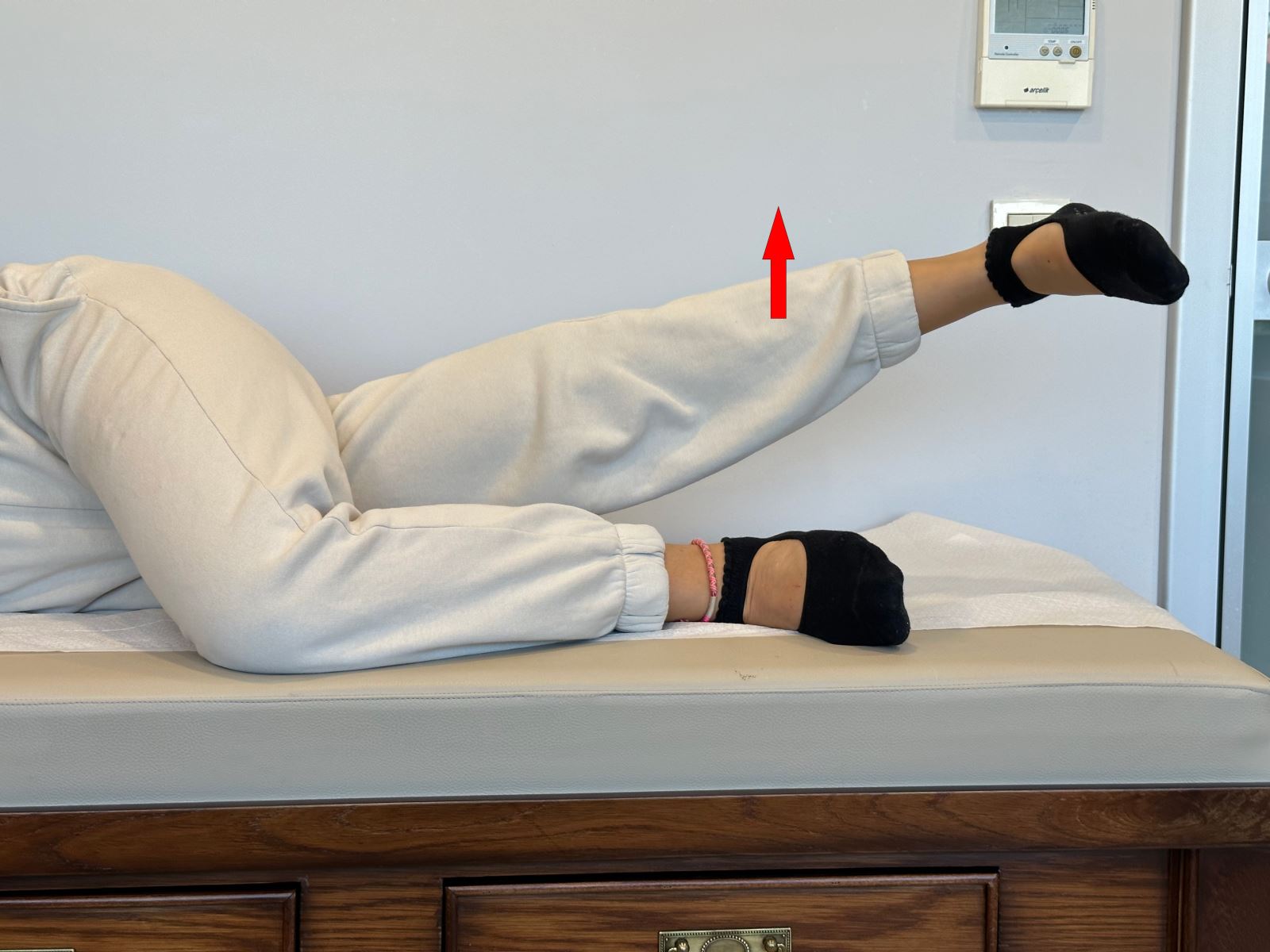 Yan yatarken üstteki bacağınızı düz bir şekilde yukarı doğru kaldırarak yana açın.