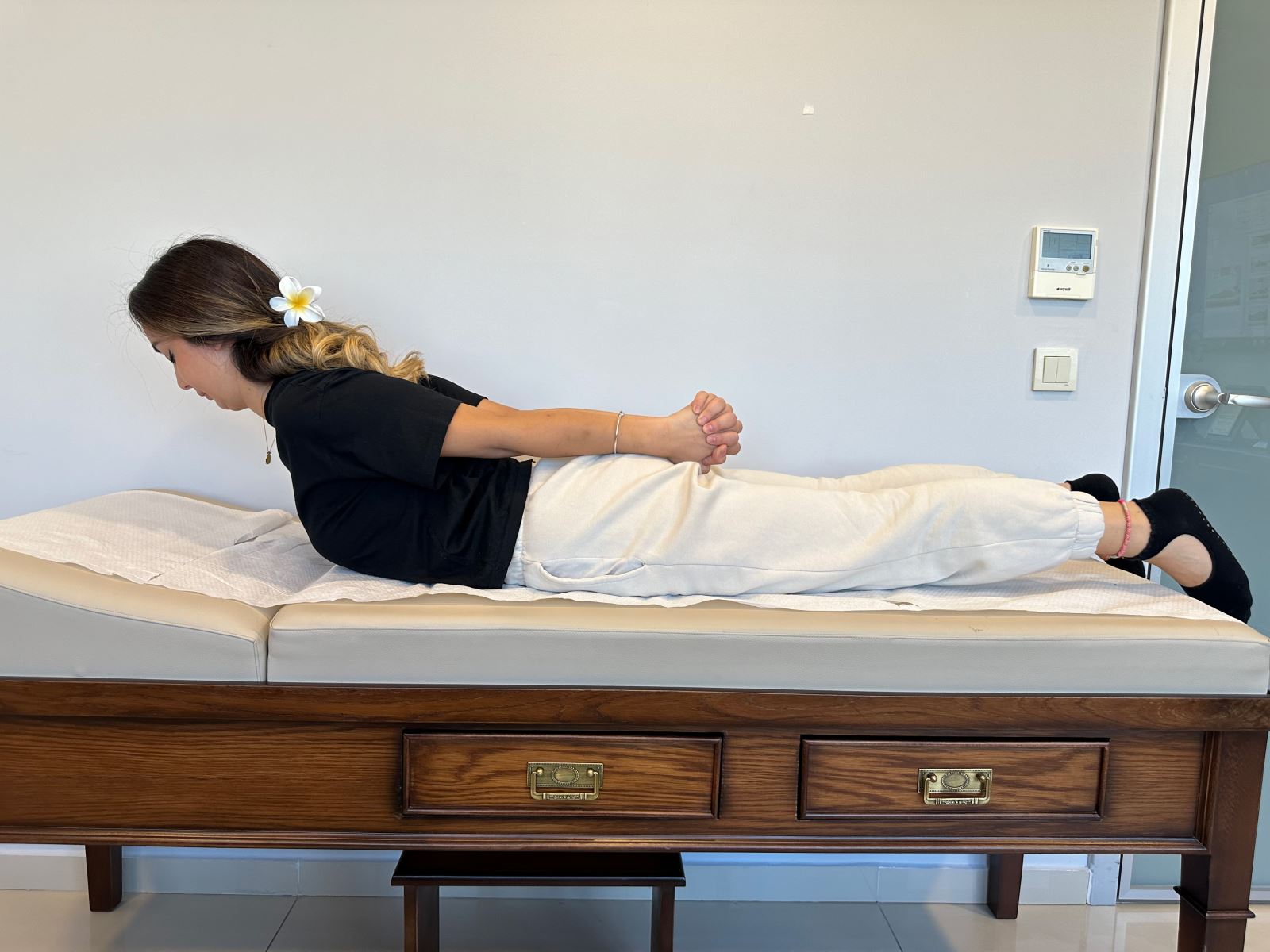 Yüzüstü pozisyonda yatın ve ellerinizi arkada birleştirin.