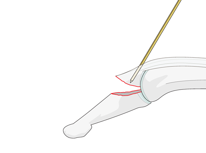 Eğer parmak ucu düşüklüğüne neden olan yaralanma açık ise ve kesici bir cisimle olmuşsa ekstansör tendonun dikilmesi gerekir. Keza kırık söz konusu ise ve kırık parçası atel kullanımı ile yerine yerleşmiyorsa ameliyat gerekebilir.