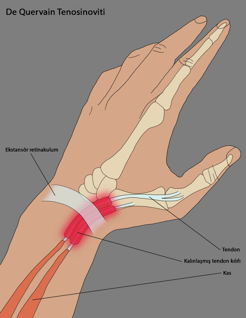 De Quervain tenosinoviti, el bileğinin başparmak tarafı boyunca uzanan ve başparmağın tabanına bağlanan tendonları etkileyen ağrılı bir durumdur. Bu durum, tendonların bilekten ele doğru giderken içinden geçtikleri kılıfın daralması sonucu ortaya çıkar. Sonuçta bileğin başparmak tarafında ağrı ve hassasiyet oluşur.