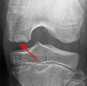 Eklem kıkırdağında bozulma olan dizin; A. Röntgen filmi, B. MR görüntüsü |