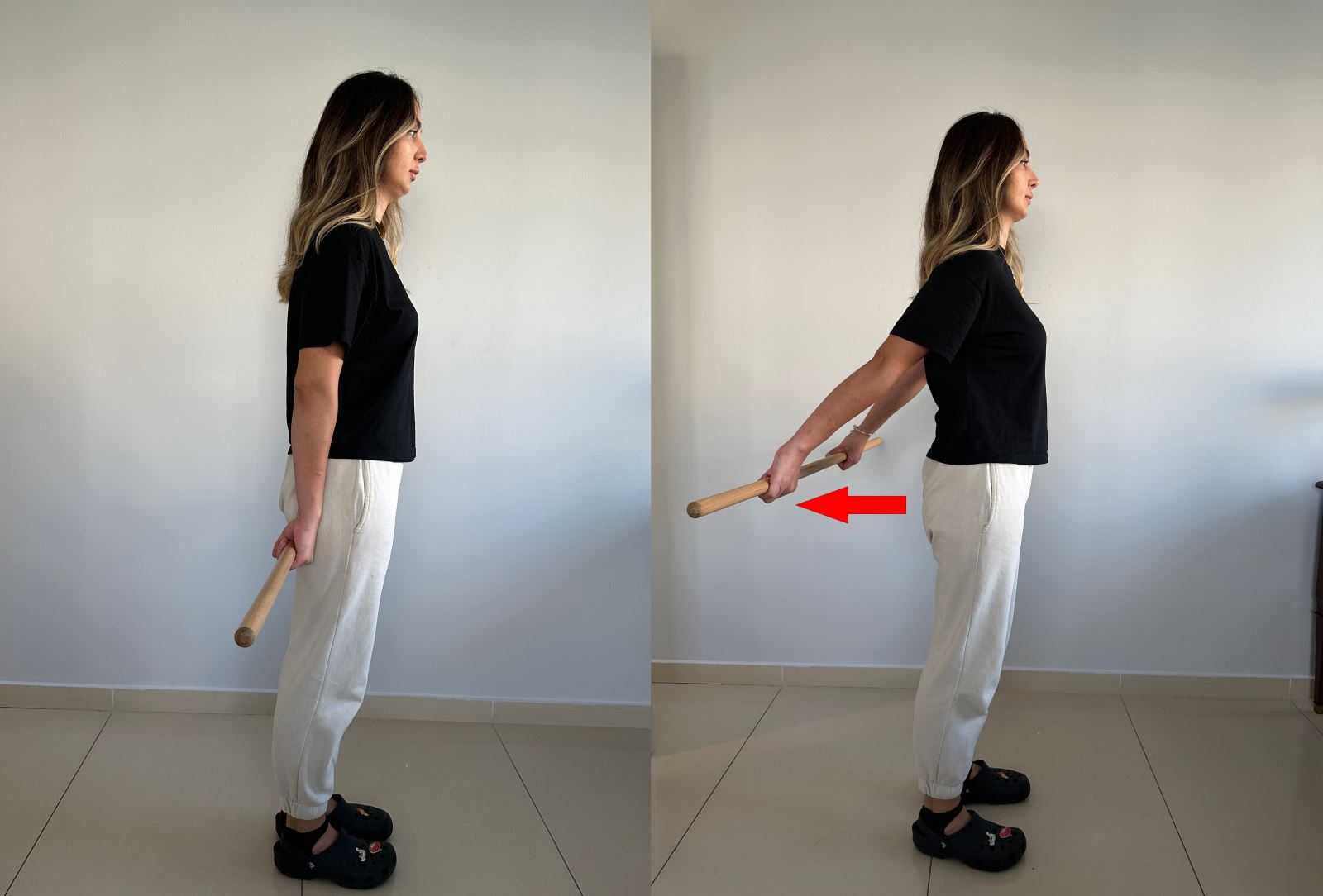Ayakta dururken sopayı gövdenizin arka kısmında omuz genişliğinde tutun.