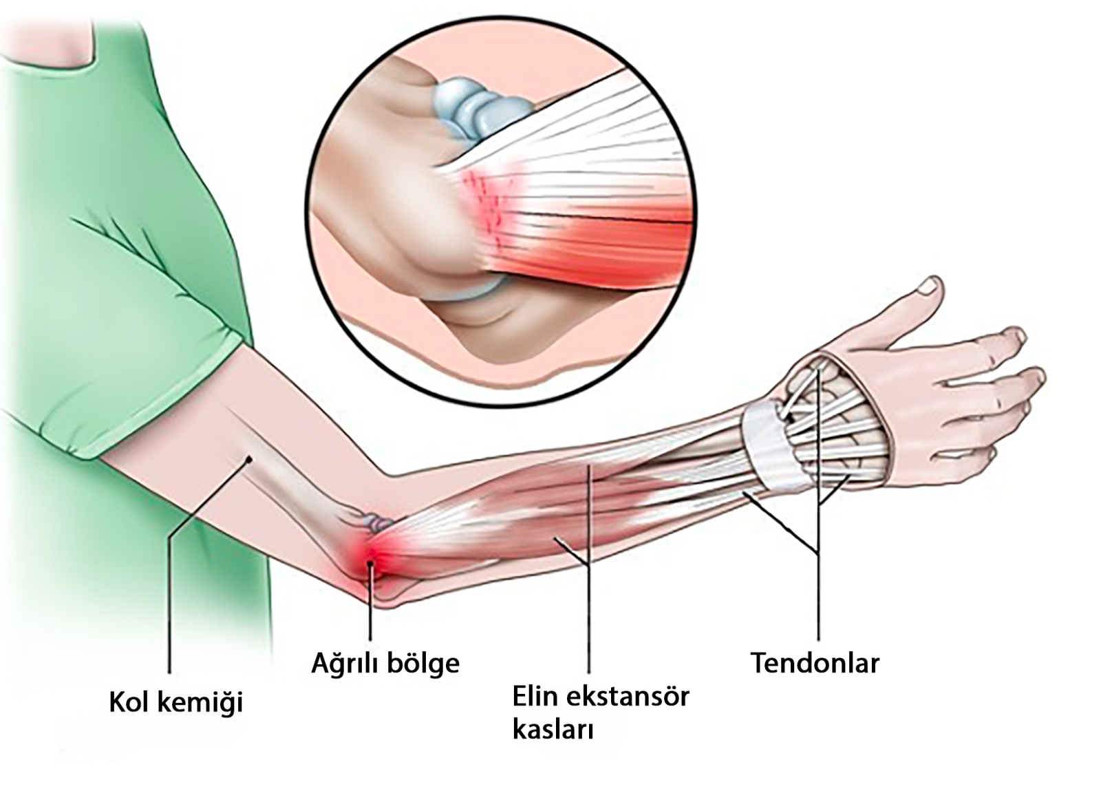 Tenisçi dirseğinde el bileğini yukarı kaldıran kaslar tutulur.